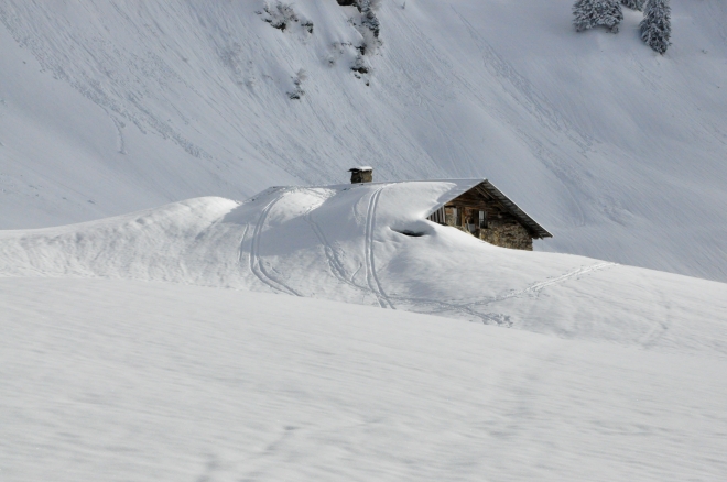 Sous la Roche Pourrie, le chalet d'alpage des Chappes est enfoui sous la neige.