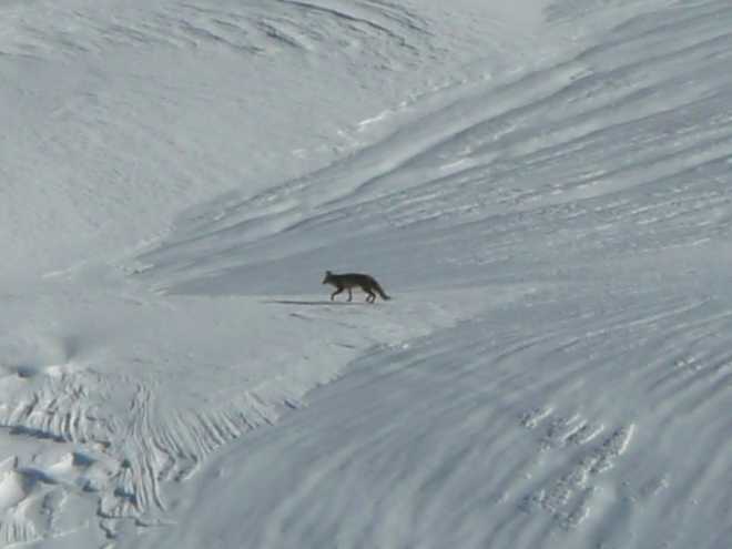 Du sommet de la butte à gauche du col, nous avons vu un loup remonter tranquillement en trottinant depuis le vallon côté Hauteluce, passer le col et redescendre vers le lac. A la descente, nous avons pu suivre ses traces jusqu'à la forêt et il y en avait beaucoup d'autres plus anciennes. 15-03-15