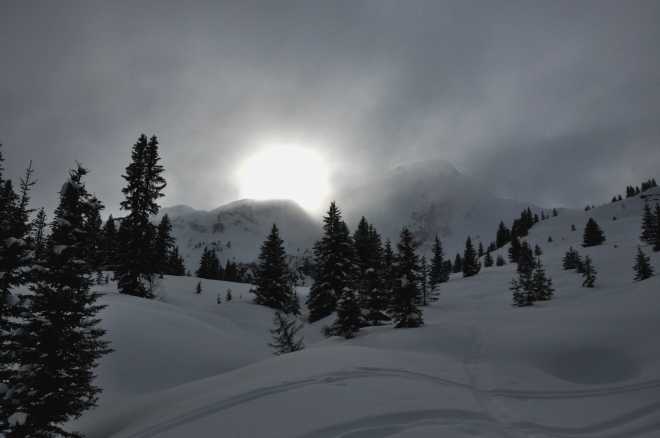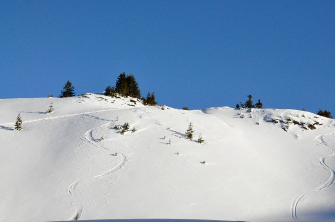 Entre la côte 2000 et le lac du Clou, quelques rares skieurs ont laissé une trace.