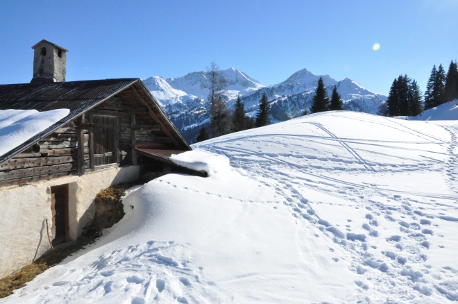 19 février 2017. Les prés au dessus du parking des Granges sont aujourd'hui libres de neige et on chausse les raquettes à Plan Villard avant d'attaquer les pentes nord-est bien ennéigées.
