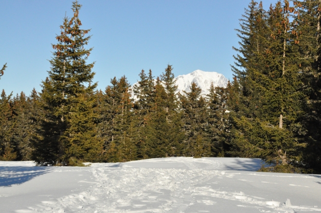 Retour en forêt vers le lac Couvert. Le Mont Blanc dépasse encore au-dessus des épicéas.