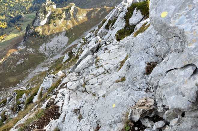 A partir de là, changement de décor, après quelques lacets, les choses sérieuses commencent. Vous pouvez laisser vos bâtons, vous aurez besoin de vos deux mains. A n'entreprendre que par temps dégagé et sec. L'itinéraire est, par contre, bien balisé (points jaunes et cairns).
