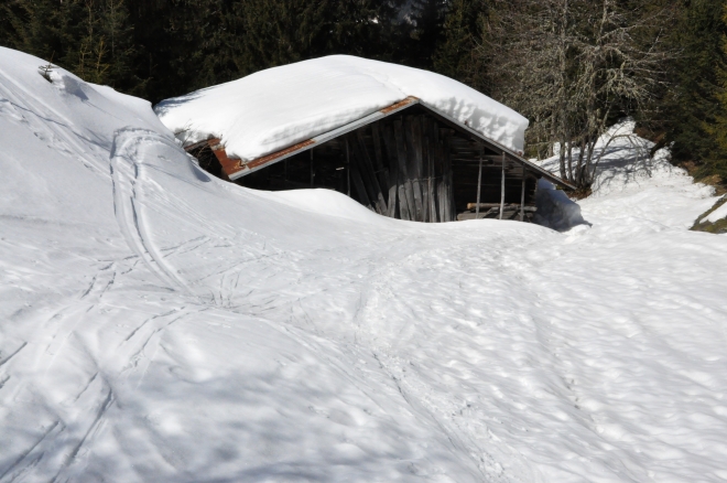 Fin mars 2016, grand beau. Mis à part dans le pré de départ, absence de neige jusqu'aux chalets de la Montaz où l'on chausse les raquettes.