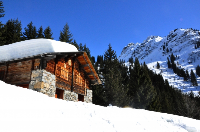 Remonter le pré en bordure de forêt puis suivre les balises du sentier d'été à travers la forêt jusqu'aux chalets de la Montaz.