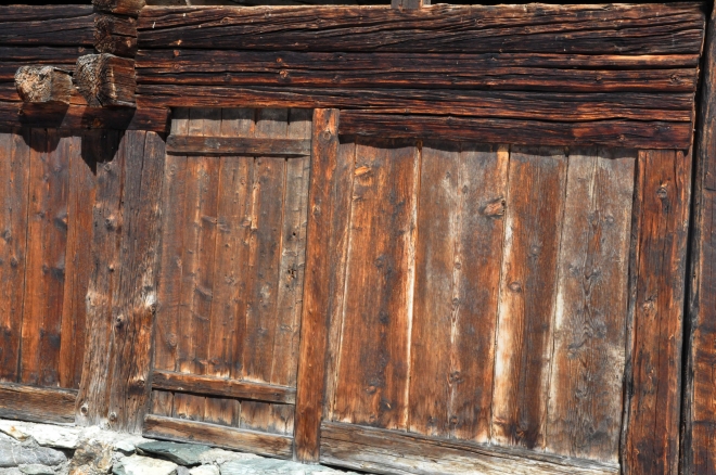 Chalets de la Commanderie. Détail des madriers, vieux de plus de 200 ans, brulés par le soleil.