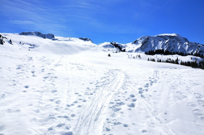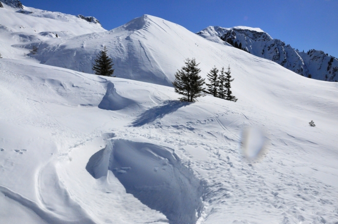 Le petit vallon qui permet d'accèder plus haut, au Plan de la Mouille. Parfois quelques coulées en travers du passage.