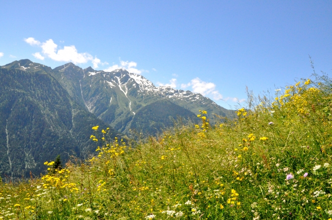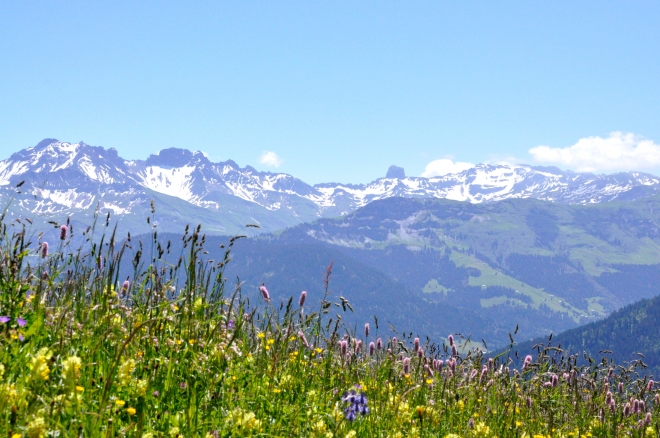Début juillet, les alpages n'ont pas encore été paturés. Au fond le Mont Mirantin.