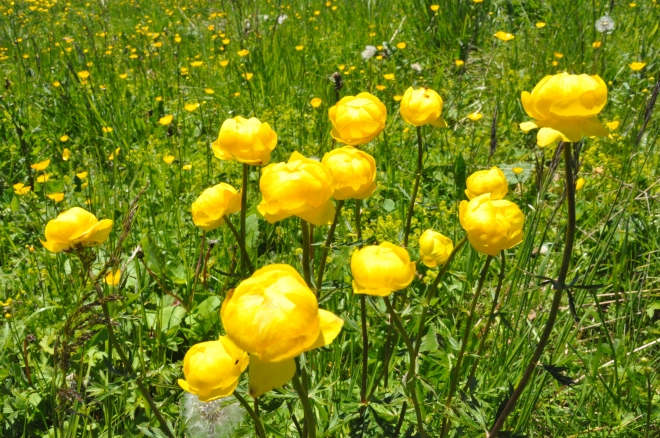 Descente par le même chemin, face au paysage. L'occasion de mieux profiter des prairies fleuries. Des renoncules.