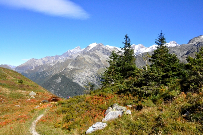 Après avoir laissé le GR5 sur la droite, le sentier traverse un large plateau, superbe belvédère sur le Mont Blanc.