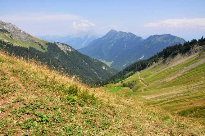 Du col de Drison, la vue côté Tamié avec la Belle Etoile, la Dent de Cons et le Charvin au fond.